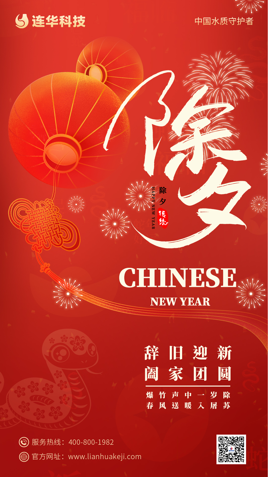 舊歲的余暉 漸漸隱沒于時光的幕后 新的一年 攜著新生的憧憬與希冀翩然而至 除夕佳節(jié) 連華科技全體員工恭祝大家 蛇來運轉巳巳好 心想事成步步高 家庭幸福美滿 生活平安喜樂