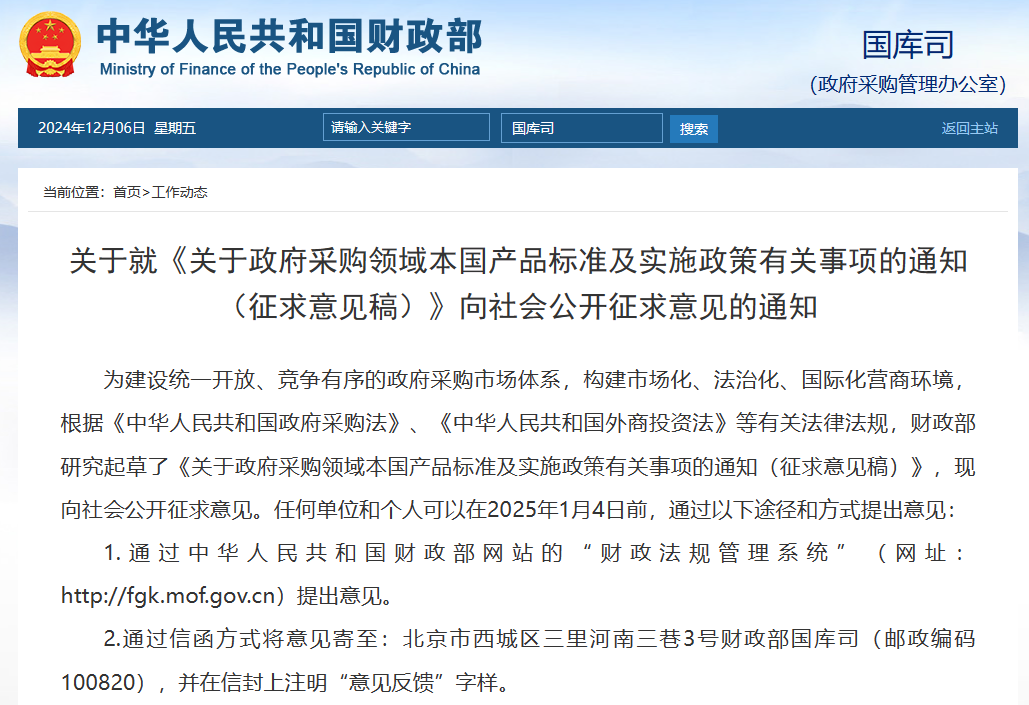 近日,財政部在其官方網(wǎng)站上發(fā)布了《關(guān)于政府采購領(lǐng)域本國產(chǎn)品標(biāo)準(zhǔn)及實施政策有關(guān)事項的通知(征求意見稿)》,并向社會各界公開征求意見。該通知旨在構(gòu)建統(tǒng)一開放、競爭有序的政府采購市場體系,保障各類經(jīng)營主體平等參與政府采購活動,并明確提出在政府采購活動中,給予本國產(chǎn)品相對于非本國產(chǎn)品20%的價格評審優(yōu)惠。