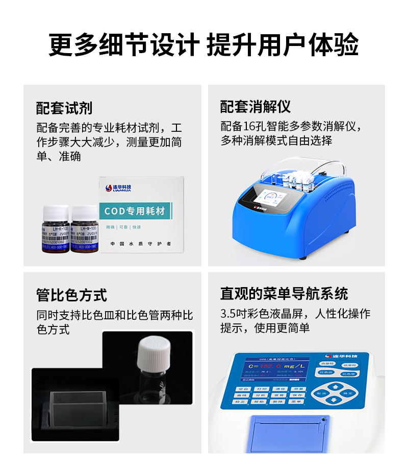 簡要描述: 儀器依據(jù)《水質(zhì)化學(xué)需氧量的測定快速消解分光光度法(HJ/T399-2007)》標(biāo)準(zhǔn)設(shè)計,采用雙光路無干涉系統(tǒng),可以測定COD高量程、COD低量程水樣,同時支持皿比色與管比色兩種比色方式,便于用戶選擇合適的耗材進(jìn)行實(shí)驗(yàn),具有極高的便利性和性價比。