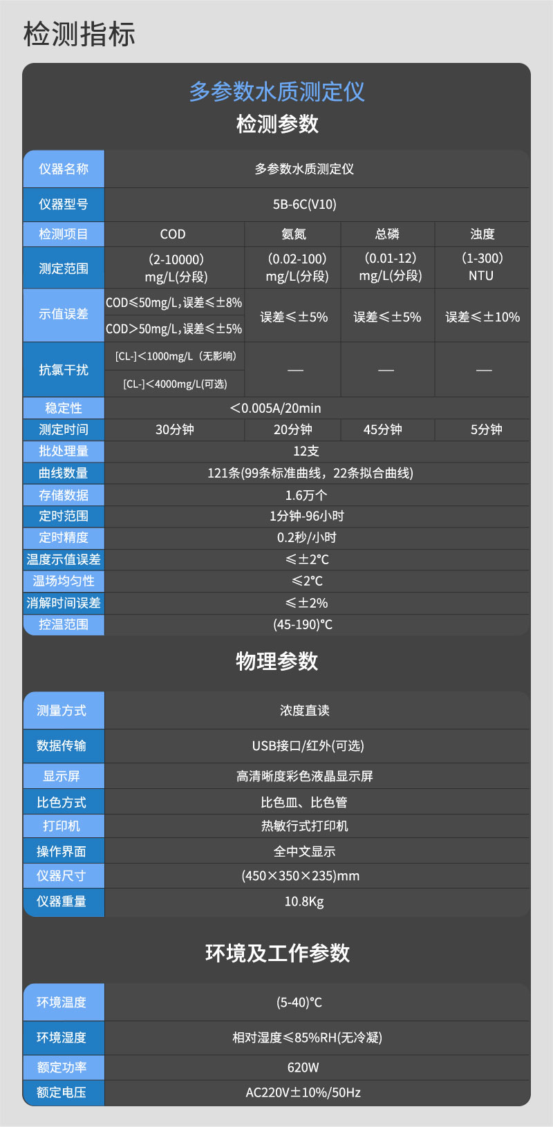 5B-6C(V10)多參數(shù)水質測定儀在穩(wěn)定性、準確性、測定范圍、多功能、實用簡便性等多方面實現(xiàn)了質的提升,具有很高的性價比,可測定COD、氨氮、總磷、濁度四個指標。